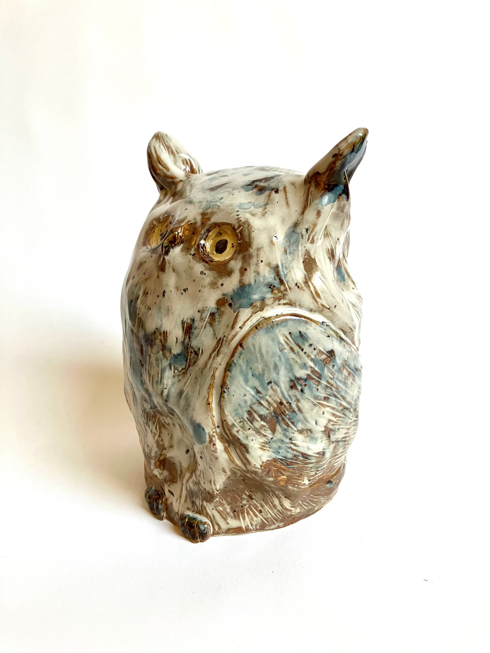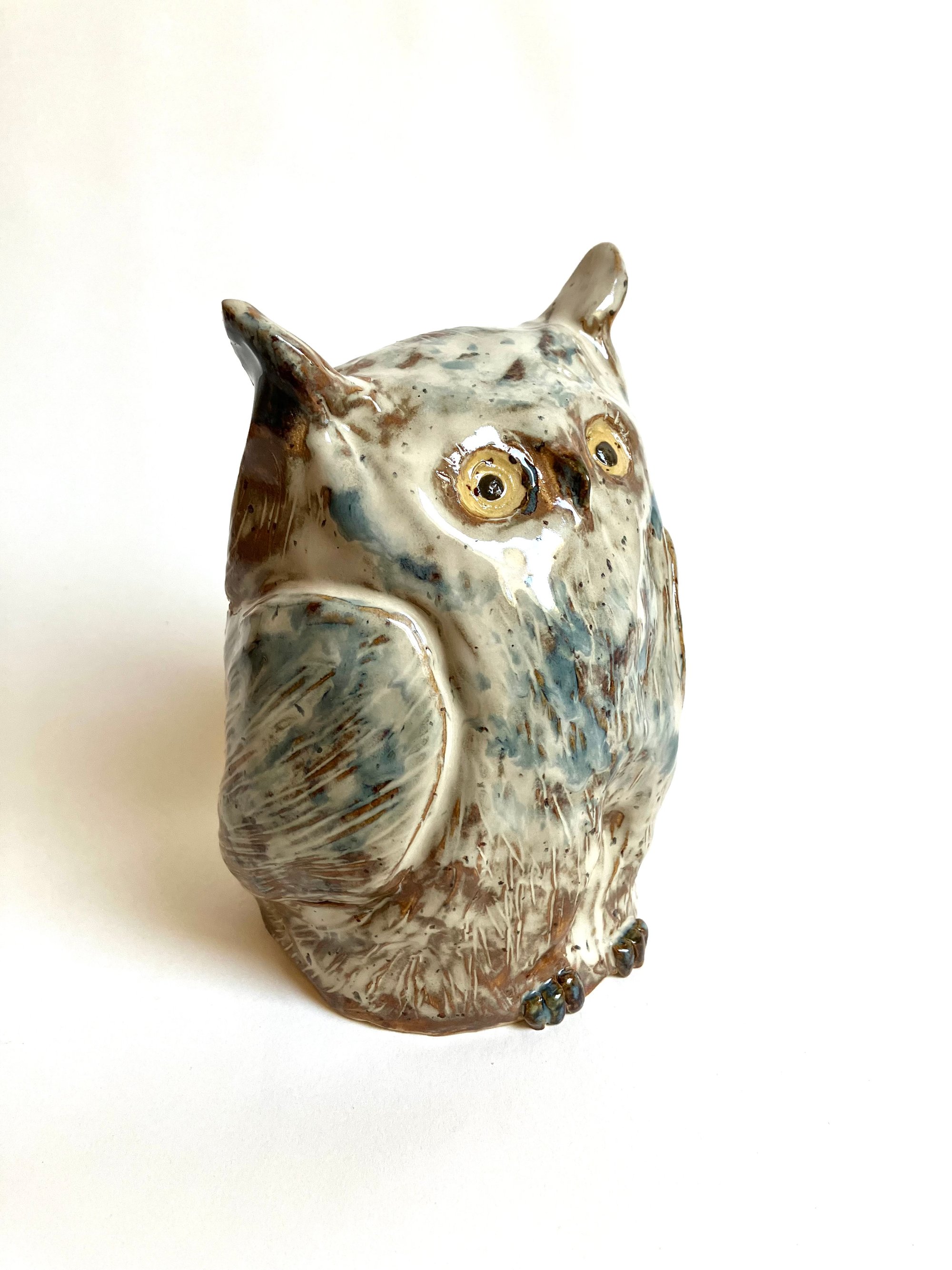 Denne søde stentøjs-ugle har gule, nysgerrige øjne, og en fjerpragt af farver, der changerer mellem brune, cremehvide og blålige toner.